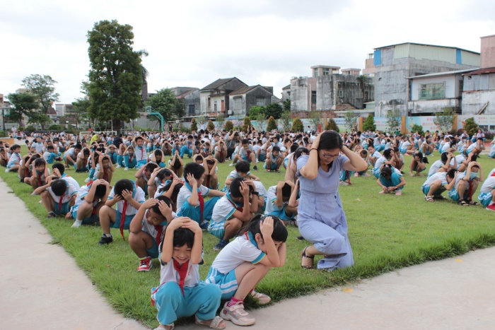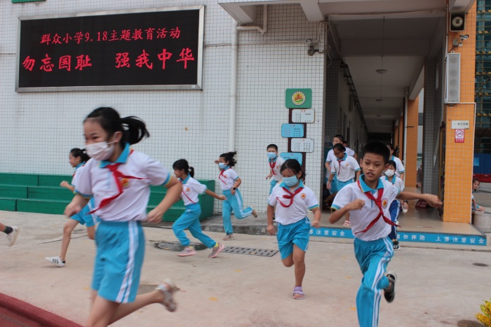 “嗚——嗚——”隨著防空警報(bào)響起,全體學(xué)生在老師的指揮下,迅速進(jìn)入應(yīng)急狀態(tài),有序緊急疏散學(xué)生。所有學(xué)生按照防火逃生演練路線(xiàn),迅速而有序地通過(guò)各樓層疏散撤離到學(xué)校操場(chǎng)上。
