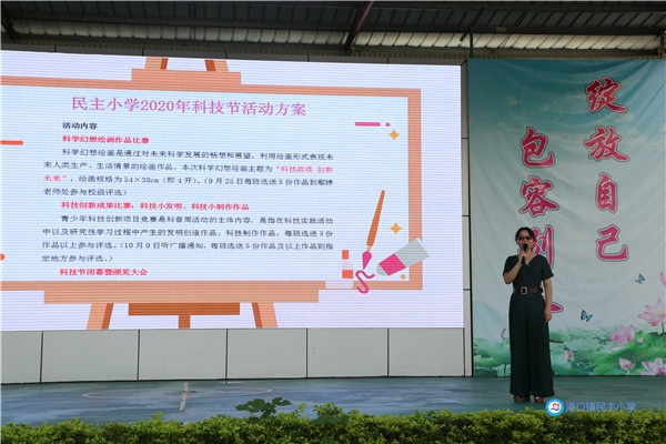 濃情九月,碩果飄香。為全面貫徹落實(shí)《全民科學(xué)素質(zhì)行動(dòng)計(jì)劃綱要》精神,在全校大力普及科學(xué)知識(shí),弘揚(yáng)科學(xué)精神,形成學(xué)科學(xué)、愛(ài)科學(xué)、用科學(xué)的良好氛圍,2020年9月21日上午,民主小學(xué)全體師生齊聚學(xué)校操場(chǎng),舉行“科技 創(chuàng)新 體驗(yàn) 成長(zhǎng)”為主題的2020學(xué)年科技節(jié)啟動(dòng)儀式。活動(dòng)由余麗苑老師主持。