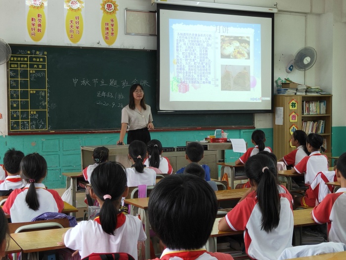 第一部分“花好月圓秋情濃”。2020年9月26日,在各班的班會(huì)課開始后,從低年級(jí)教室里傳來了甜甜的兒歌:“月兒圓、月兒亮,月餅甜啊月餅香……”;中年級(jí)組的班主任播放動(dòng)漫視頻《中秋節(jié)的來歷》,引起了學(xué)生們學(xué)習(xí)中秋節(jié)的興趣;高年級(jí)組的班主任則以一首膾炙人口的《水調(diào)歌頭》喚醒了學(xué)生對(duì)中秋的深切共鳴。班主任還與學(xué)生們分享了“吳剛伐桂”、“玉兔搗藥”的故事。最后,學(xué)生們紛紛交流了自己家鄉(xiāng)慶祝中秋節(jié)的風(fēng)俗,如“賞月祭月”、“玩花燈”、“吃月餅品佳果”等風(fēng)俗。