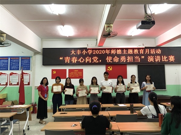 為了進一步加強師德師風(fēng)建設(shè),全面提升教師思想政治素質(zhì)和職業(yè)道德水平,努力造就一支師德高尚、業(yè)務(wù)精湛、充滿活力的高素質(zhì)教師隊伍,10月12日下午,大豐小學(xué)結(jié)合“不忘初心,牢記使命”師德建設(shè)主題教育月活動舉行了一次“青春心向黨,使命勇?lián)?dāng)”的演講比賽。