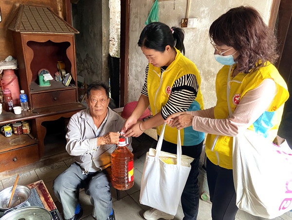 10點整,陽光柔柔地灑在校園的道路上,五對親子義工以及社區(qū)志愿者們在校門口集合。集合完畢后,親子義工和志愿者們上門對社區(qū)的老人進行慰問。一聲問候,兩句細語,談話時溢出無處不在的濃濃情意,在老人們的家里,他們與老人們拉拉家常,詳細了解他們家庭、生活和健康狀況,傾聽他們的心聲,提醒他們注意身體健康并送上慰問品,同時為老人們送去了節(jié)日的問候,讓老人們深深感受到了大家尊老敬老的愛心與溫暖。老人們臉上都掛著溫暖的笑容。