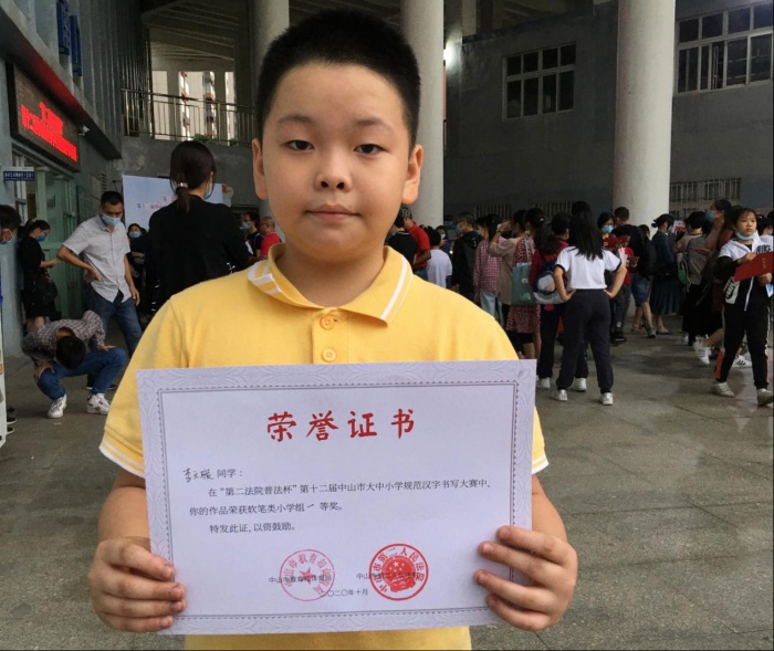 這次書寫大賽,全市共收到六百多份硬筆和軟筆作品,港口鎮(zhèn)下南小學李文駿同學作為最年幼的選手在全市小學組軟筆書法項目中斬獲一等獎,入選代表中山市參與省賽。