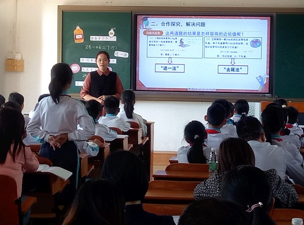 活動中,石特小學的兩位青年教師分別上了兩節(jié)展示課,易婉琳老師給大家展示了一節(jié)精彩的課例——《用商的近似值解決問題》。課堂上,易老師的教學形式靈活多樣,語言親切自然,有效地調(diào)動了學生的學習積極性,讓學生在輕松愉快的氛圍中學習。余冰昕老師講了一節(jié)概念教學課《圓的認識》,余老師的數(shù)學語言精煉,通過分組合作探究學習,培養(yǎng)了學生合作探索的能力,讓他們學習情緒高漲,收到良好的教學效果。