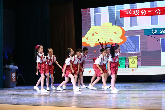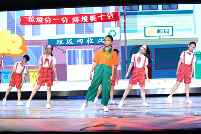 歌舞劇《垃圾王的故事》立足環(huán)保,從校園生活入手,12名學(xué)生用唱跳結(jié)合的方式講述了“垃圾王”做好事并帶領(lǐng)同學(xué)進(jìn)行垃圾分類的故事。從十月初接到比賽通知開始,楊楚楚、周金波、林群三位指導(dǎo)老師便開始落實(shí)劇本撰寫、角色篩選及排練等相關(guān)事宜。定下角色之后便開始了一日三次的排練,晨間的樂器室、午休和放學(xué)的舞蹈房都見證了老師和孩子們?yōu)榱舜舜螒騽”荣惙磸?fù)練習(xí)、揮汗如雨的樣子。