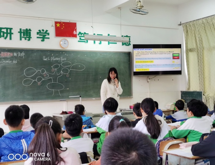 第一節(jié)課由三角鎮(zhèn)中心小學英語老師楊秀文老師執(zhí)教。楊老師的課思路非常清晰,與學生配合完美。此外,她的教學指令明白簡短,學生一聽就會;在閱讀之后楊老師給學生播放了關于環(huán)保、植樹造林的英文小視頻,引起了學生和聽課老師們的興趣,激起師生間的思維碰撞,讓師生相互誘導、成長,達到融為一體的境界。