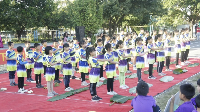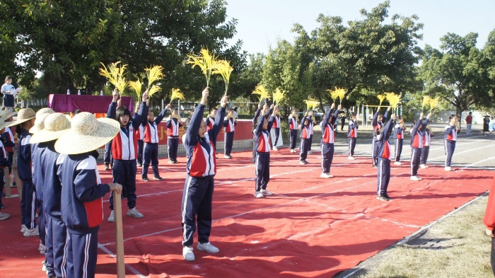 緊接著,各班特色方隊依次入場,他們精神抖擻,燦爛的笑容抒寫著他們的熱情,激昂的口號透露出他們的堅定。各支隊伍各有特色,各隊伍結(jié)合學(xué)校水鄉(xiāng)文化特色,充分挖掘水鄉(xiāng)元素資源,有的扛著鋤頭、有的提著籃子,準(zhǔn)備春種;中年級的孩子們穿著鮮艷的水鄉(xiāng)服裝,打著雨傘、帶著草帽在田原里、土地里忙活著除草、殺蟲、施肥等;高年級的同學(xué)們卻忙著收成,他們在秋季大豐收,金黃的稻谷、肥壯的蘿卜、番薯、玉米···,還有一串串的大香蕉呢。各班用舞蹈、歌唱、吟誦、模仿勞作場景等豐富的形式,把水鄉(xiāng)一年中春種—夏忙—秋收表現(xiàn)得淋漓盡致,讓現(xiàn)場的觀眾看得津津樂道。