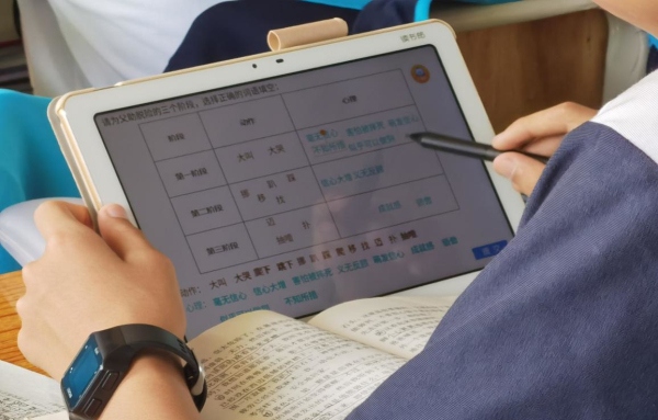 本次活動由初一年級何凱賢老師主講莫頓·亨特的《走一步,再走一步》。何凱賢老師以自主檢測,檢查預習、快速默讀,圈點勾畫、自主默讀,梳理情節(jié)、自主精讀,把握心理、自主探究,領悟主旨為教學思路,熟練地運用了讀書郎智慧課堂設備進行授課。課堂上學生人手一部讀書郎平板電腦,登錄進入何老師的課堂,平板電腦的畫面便與講臺上一體機的畫面同步,坐后排的同學也能通過平板把PPT的內(nèi)容看得清清楚楚。