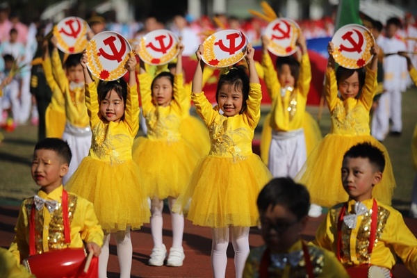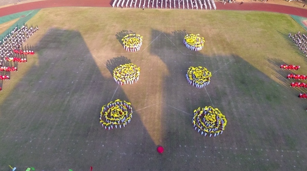 臺下同學(xué)們用如潮的掌聲詮釋他們必將不負(fù)期望的決心。掌聲平息,音樂又響起,是同學(xué)們精心排練的團體操。一二年級的同學(xué)站成方陣,隨著“送給你小心心,送你花一朵”的歌聲,向主席臺比心,引得在場觀眾紛紛舉起手機拍攝。三四年級則是舉起絹扇,舞動出層層赤浪,變換陣型擺出“中山”“華附”“17”等字形,隊形整肅,效果卓群。五六年級緊隨其后,排列出五角星,展示自己一顆赤子之心。