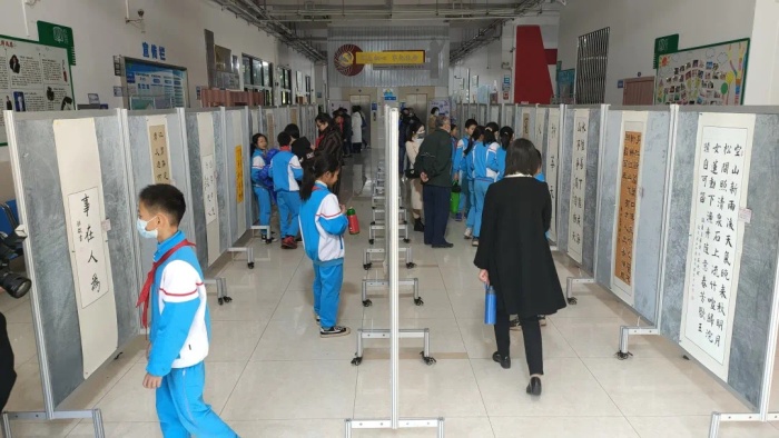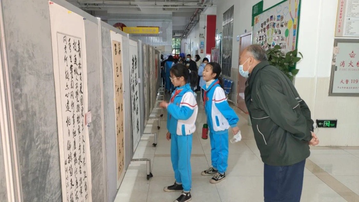 隨后,領(lǐng)導(dǎo)嘉賓們、師生代表、家長代表共同參觀了師生的書畫作品。本次展覽主要展出了約60件師生作品以及友好人士書法作品。這些作品內(nèi)容豐富,精彩紛呈,行楷篆隸,字體各異。有些學(xué)生作品看似簡單,略顯稚嫩,但都凝聚著老師和學(xué)生的智慧和心血,抒發(fā)著對中華傳統(tǒng)文化的無限熱愛,感懷著書畫藝術(shù)的獨特魅力。