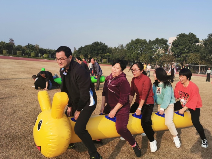 和煦的陽光照在人們的身上暖洋洋的,足球場(chǎng)上都是歡聲笑語。本次活動(dòng)以科組為單位分小組進(jìn)行,內(nèi)容包括“毛毛蟲向前沖”、“不倒森林”和“一轉(zhuǎn)到底”等趣味游戲項(xiàng)目。學(xué)校工會(huì)主席莫謀珍介紹游戲規(guī)則,接著宣布活動(dòng)開始,點(diǎn)燃了大家的熱情。其中“毛毛蟲向前沖”最為有趣,場(chǎng)上各科組老師排成一隊(duì),跨坐在胖胖的“毛毛蟲”身上,一起喊著口號(hào),提著毛毛蟲卯足干勁向前沖,活動(dòng)場(chǎng)面精彩不斷,熱鬧非凡。“毛毛蟲”項(xiàng)目老師們體驗(yàn)到運(yùn)動(dòng)的快樂,也增強(qiáng)了老師們的團(tuán)結(jié)合作意識(shí)。