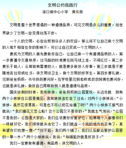 為響應(yīng)全國文明城市和文明校園創(chuàng)建的相關(guān)活動(dòng),讓學(xué)生深入理解文明公約的內(nèi)容,把文明禮儀落到實(shí)處,養(yǎng)成學(xué)生文明的學(xué)習(xí)和生活習(xí)慣。10月13日,港口鎮(zhèn)中心小學(xué)結(jié)合學(xué)校實(shí)際開展了“踐行文明公約,爭做文明小公民”主題活動(dòng)。