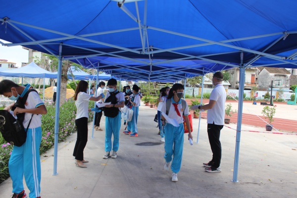 響應(yīng)中山市中小學(xué)復(fù)學(xué)要求,學(xué)校實(shí)施了錯時錯峰上下學(xué)的措施。同學(xué)們身著整齊的校服,佩戴口罩,保持1米以上間隔,在門口檢測體溫正常后方可入校。老師們在校門口熱情地歡迎學(xué)生們返校,并時刻做好應(yīng)對突發(fā)情況的準(zhǔn)備。