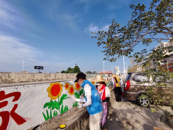 30日下午,在群眾社區(qū)工作人員的帶領(lǐng)下,群眾小學(xué)的教師黨員及教師志愿者們前往港口高速出口橋頭,通過繪畫的方式為它提升“顏值”。老師們在繪畫的過程中認真嚴謹,一絲不茍,即使他們的額頭上布滿了汗水,手上也沾上了許多染料,但他們既不怕苦、也不怕累,力求細心地勾勒出每一根線條,涂好每一塊顏色。