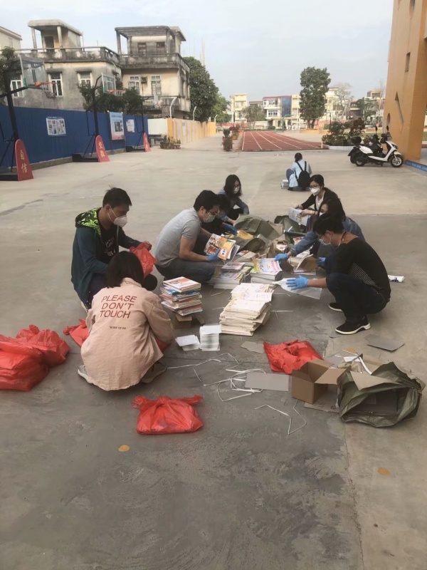 2月29日,陽光明媚,春風襲人。學校各班班主任、家長志愿者們分年級、分批準時來到學校,他們戴著口罩和手套,經過校門口的體溫檢測后走進校園,將教材按各年級、各班進行分類,并貼心地用塑料袋將書本一袋袋打包好,寫上學生的姓名。書本派發(fā)時間緊、任務重,班主任與家長志愿者們一刻也不耽擱。他們細心分類,有序打包,全然不顧那衣背上滲出的汗珠,大家分工合作,以最快的速度完成了分書裝袋打包工作。