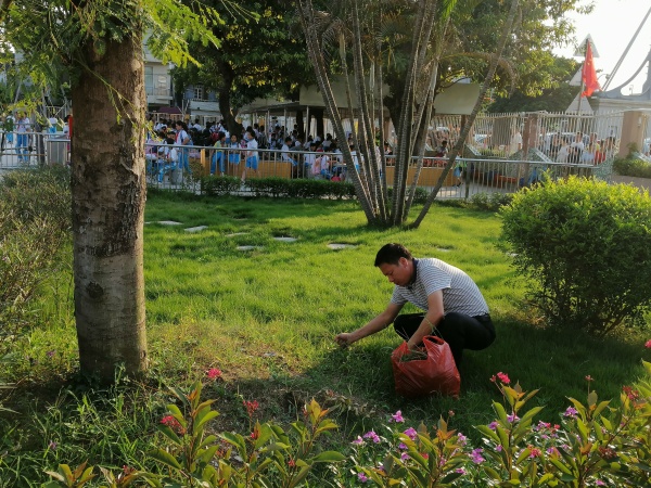 活動中,黨員同志們充分發(fā)揚不怕臟、不怕累的精神,按照分工拿取活動所需工具,全面認真打掃校園內(nèi)和校門外各處衛(wèi)生死角,有的打掃地面的落葉,有的清理雜物,有的清除花基內(nèi)的垃圾和雜草,有的清掃學校門口的廢紙……黨員同志們勞動的身影成為了校園中一道美麗的風景線,令人動容。太陽絲毫不因大家的汗水而有所收斂,但是大家依然熱情不減,讓校園周邊環(huán)境更美好的決心不因炎熱的天氣而減少。經(jīng)過大家的辛勤努力,校園內(nèi)及校門外的環(huán)境面貌煥然一新。