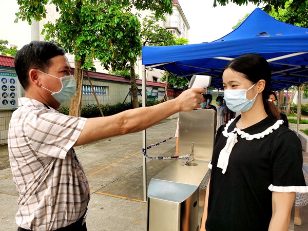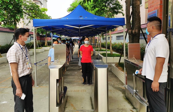 9時(shí)整,演練正式開始。這次演練分別模擬了學(xué)生入校、課室午檢時(shí)發(fā)現(xiàn)發(fā)熱等突發(fā)狀況場景下的應(yīng)急處置。演練中,參演人員按照學(xué)校應(yīng)急處置演練方案布置,按照各自的分工和職責(zé)規(guī)范站位,整個(gè)演練活動(dòng)緊張、認(rèn)真、有序地進(jìn)行。演練結(jié)束后,全體人員再次集中,梁容根校長對(duì)實(shí)戰(zhàn)演練進(jìn)行總結(jié),強(qiáng)調(diào)了防控工作的重要性,強(qiáng)調(diào)復(fù)學(xué)工作必須堅(jiān)持以“外防輸入,內(nèi)防反彈”為原則,動(dòng)員大家高度重視。