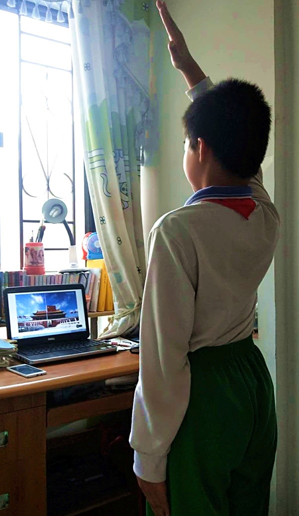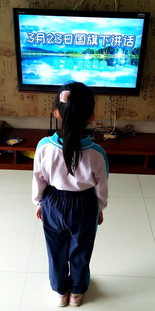 早上8時,石特小學(xué)的全體學(xué)生穿好校服,少先隊員們戴好紅領(lǐng)巾,面向鮮艷的五星紅旗,立正敬禮,唱著國歌,在家中進行特殊而又莊嚴的升旗儀式。隨后,六(1)班的陳思雅同學(xué)進行了國旗下講話,呼吁同學(xué)們熱愛、保護自然,關(guān)注、敬畏生命。