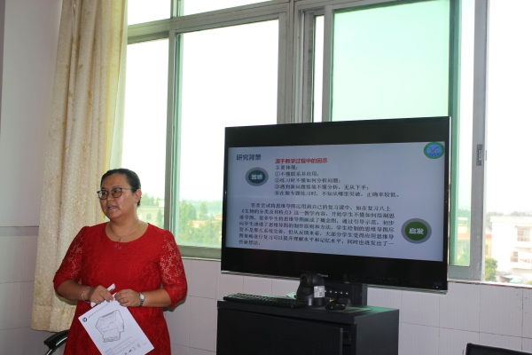 報告會伊始,主持人宣布儀式開始,并介紹了與會領(lǐng)導(dǎo)及相關(guān)參會人員。然后,鎮(zhèn)級生物立項課題《思維導(dǎo)圖在初中生物復(fù)習(xí)課中應(yīng)用的實踐研究》主持人張麗君進行課題中期匯報,她針對課題的開展情況,取得的階段性成果以及存在的問題等進行了詳細的PPT匯報,全方位地展示了這一年以來課題組的具體研究情況和成果以及后期工作構(gòu)想。接著,鎮(zhèn)級英語立項課題《初中英語閱讀理解題型分類及解題方法的研究》主持人姚文志進行課題中期匯報,他從課題研究背景、研究目標、研究思路、課題的研究方法、研究計劃、項目研究進展成效、取得的成功、存在問題或困惑、今后努力方向等八個方面作了報告。