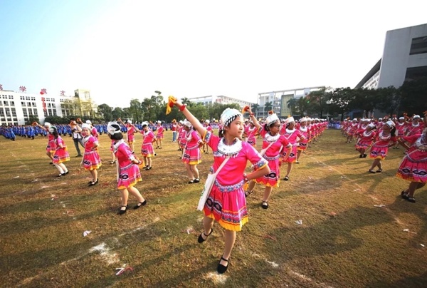 初三年級(jí)1100多人分別演繹 “七龍迎春”“喜慶鬧春”的春節(jié)民俗,“壯懷激烈”的端午民俗,“詩(shī)意溫存”的中秋民俗,以及“百花齊放”的民族風(fēng)情民俗。