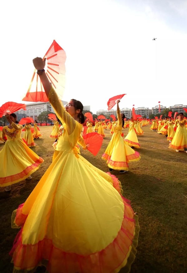 高一年級(jí)600余名學(xué)生組成體操隊(duì),他們身著亮麗的衣裙,揮舞手中的中國(guó)紅,充分展示了中國(guó)人民奮進(jìn)新時(shí)代的精氣神。