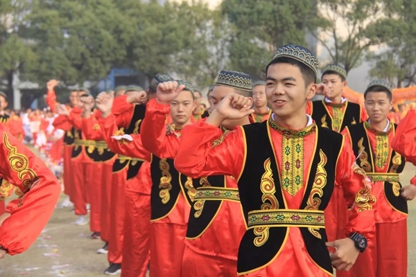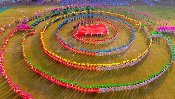 初二年級(jí)以歡欣鼓舞的各民族舞蹈演繹“民族平等、民族團(tuán)結(jié)、共同發(fā)展”的主題,伴隨著動(dòng)感的鼓點(diǎn)音樂,“56”“70”“愛我中華”“祖國(guó)萬歲”等關(guān)鍵詞字樣相繼排出,56個(gè)民族團(tuán)結(jié)一條心的巨型圓形花卉絢爛綻放,象征民族團(tuán)結(jié)之花開遍祖國(guó)大地。