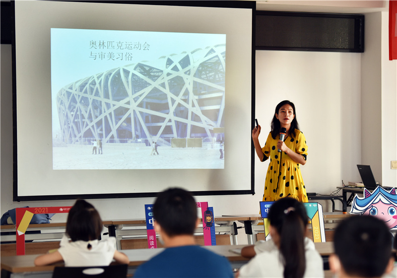 阮波從近期東京奧運(yùn)會(huì)講起,從“奧林匹克運(yùn)動(dòng)會(huì)與審美習(xí)俗”,到東西方神話人物在衣服穿搭、妝容、人物性格塑造的異同及戲劇人物的審美比較,論證“真”“善”“美”的辯證聯(lián)系。過程中阮波不時(shí)提問,邀請(qǐng)親子家庭互動(dòng)作答,引導(dǎo)家長(zhǎng)從小注重對(duì)孩子審美能力的培養(yǎng),并推薦相關(guān)閱讀書目。