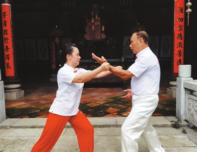 “食過夜粥”(粵俗語,指會功夫、懂武術)的武林中人,總會用生動、地道的方言來描述他們熱愛的功夫,劉家拳中就有一句拳諺“蠄蟧爪(蠄蟧粵語指的是一種蜘蛛,蠄蟧爪則是形容劉家拳的橋手快速敏捷)、蝦公腰(在腰力的運用上要有蝦腰一般的爆炸力)”。記者在拍攝時特意請蕭永定和他的孫女、劉家拳第五代傳承人蕭美泳一起來演繹這一動作特點。