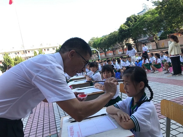 開筆禮第一環(huán)節(jié)是正衣冠,孩子們在低段語文科組長蔡老師的帶領下正衣冠,這是孩子們知書明理的第一步;隨后,在李杰華的帶領下,老師們?yōu)楹⒆觽冎焐皢⒅?,在他們的額頭中間點上朱砂印,祝福他們從此眼亮心明,啟迪智慧。第三環(huán)節(jié)由體育老師擊鼓明智,在三聲鼓聲中,孩子們跟隨謝老師明禮。第四環(huán)節(jié)由書法老師啟蒙描紅,李老師手握毛筆,飽蘸濃墨,在掛起的宣紙上教學生們一撇一捺寫下一個“人”字,寓意在人生的啟蒙階段學會做人是最為重要的。每班學生代表也在紙上認認真真地書寫“人”字并展示;最后一個環(huán)節(jié)是鞠躬敬師,全體老師上臺接受學生三鞠躬,接著向孔子畫像行“三拜禮”,表達尊敬敬師之情。