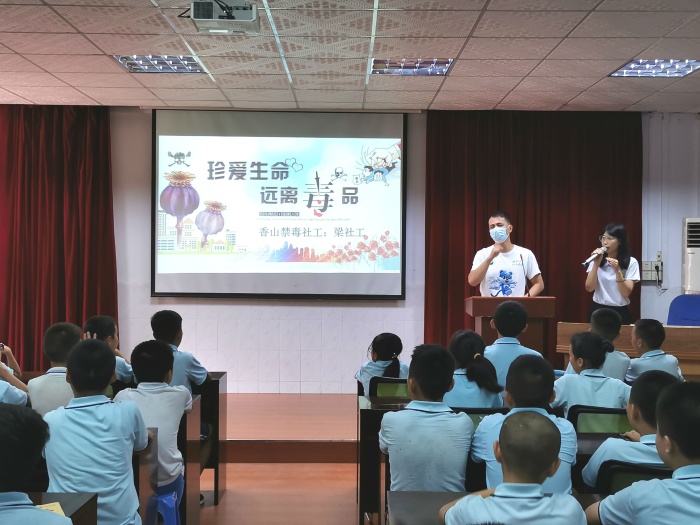 活動中,沙溪禁毒辦社工們針對青少年好奇心強,辨別能力、自制力較差,容易受犯罪分子的誘惑利用這一特點,以刑事責任年齡和毒品的嚴重危害后果為切入點,用干練利落的言談舉止,幽默風趣的表達風格,獨特活潑的授課方式,系統(tǒng)地引導學生學習什么是毒品、什么是吸毒、毒品的危害、毒品預防類、以及拒毒技巧等知識。警醒同學們要珍惜自己美好的青春年華,選擇健康的娛樂活動和生活方式。同時,在禁毒工作人員梁社工的引導下,六年級學生一起觀看了禁毒動畫短片《阿威 禁毒俠出場》,并且邀請了動畫片的主人公阿威來給學生講述自己戒毒的過程和毒品給自己、家庭帶來的傷害。