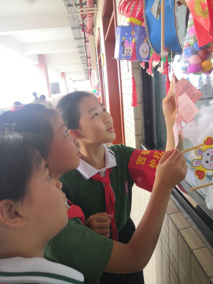 一大早,學(xué)生們滿心歡喜提著自己的燈籠進(jìn)校園,臉上掛著激動(dòng)雀躍的笑容。首先各班班主任開展了以“我們的節(jié)日——中秋佳節(jié)”為主題的班會(huì)課。課上,老師既通過精心的課件、生動(dòng)的視頻、有趣的故事,引領(lǐng)學(xué)生了解中秋有關(guān)的故事和習(xí)俗,感受傳統(tǒng)文化的魅力,也讓學(xué)生交流分享親子制作燈籠的創(chuàng)意與感受。倡導(dǎo)學(xué)生學(xué)習(xí)變廢為寶、學(xué)科融合、親子合作等優(yōu)良品質(zhì)。隨后師生一起興奮地提著燈籠拍照、布展。高高掛起的五彩燈籠裝飾了教室的走廊,成為一道靚麗的風(fēng)景線,引來了師生駐足觀賞,品鑒自己最喜歡的作品,并根據(jù)創(chuàng)意、色彩、構(gòu)造為最佳設(shè)計(jì)的作品投下神圣的一票。