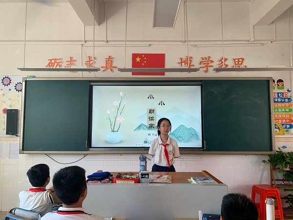 在此期間,學校抓住各種機會向全校師生宣傳推普周,推廣普通話。9月13日星期一升旗儀式上,語文科組長曹發(fā)月老師代表進行了“讓我們一起講普通話”的國旗下講話。他從五個方面向大家提出倡議,倡導輔導員老師和隊員們積極地行動起來,從自己做起,人人爭做推廣普通話和使用規(guī)范字的模范,在校園中營造良好的語言文化氛圍,弘揚民族文化,樹立民族精神,為構建書香校園而努力。