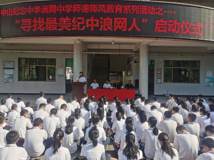 百年大計(jì),教育為本;教育百端,師德為先。為進(jìn)一步提升學(xué)校教師思想政治素質(zhì)和師德師風(fēng)水平,切實(shí)增強(qiáng)廣大教師教書育人的責(zé)任感和使命感,中山紀(jì)念中學(xué)浪網(wǎng)中學(xué)于9月15日上午,在教學(xué)樓一樓地坪舉行師德師風(fēng)教育系列活動(dòng)之“尋找最美紀(jì)中浪網(wǎng)人”啟動(dòng)儀式。本次活動(dòng)特別邀請(qǐng)了民眾街道分管教育的黃峰副鎮(zhèn)長、教育和體育事務(wù)中心黃海文主任參加。中山紀(jì)念中學(xué)浪網(wǎng)中學(xué)馮七勝副校長主持本次活動(dòng),全校師生參加活動(dòng)。