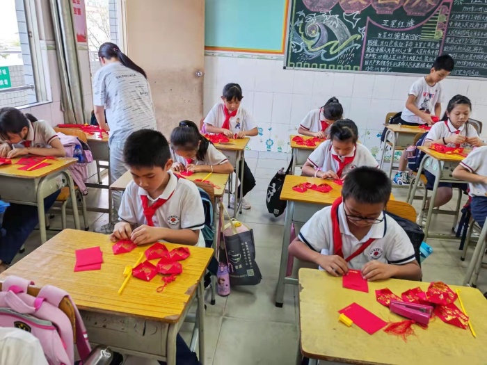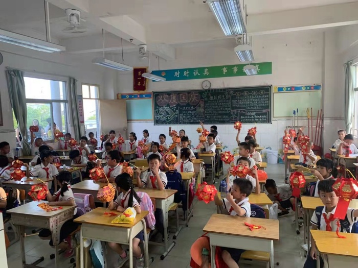 部分班級利用班會課開展手工制作燈籠活動,家委們先向同學們介紹了中秋節(jié)的來歷與習俗。接著,向同學們展示了中秋節(jié)燈籠作品,為所有同學分發(fā)了材料包,介紹了材料包里的工具。隨后,詳細地為同學們介紹燈籠的制作方法,同學們都很認真聽和觀察,聽完介紹后都迫不及待地開始動起手來。同學們按照制作步驟,先把燈籠框架組裝好,然后在紅包紙上涂上膠水,接下來在骨架上粘好紅包紙。在同學們的努力下,一個個精美的中秋節(jié)燈籠制作完成。