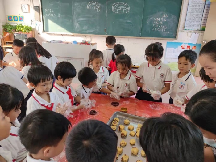 部分班級利用班會課,結合德育校本課程《巧手做美食,味濃情更濃》,組織各班開展了手工制作月餅活動,讓學生通過自己的勞動,體驗親手做月餅的樂趣,把第一次動手制作的月餅與家人一起分享,使學生體驗與他人分享帶給自己的快樂。各班家委會成員與學生全程參與活動,全體學生親自體驗了做月餅的全過程。無論是裹餡兒、模具制型,還是烘焙、包裝,各環(huán)節(jié)做得有模有樣,師生與家委樂在其中。經(jīng)過同學們的巧手加工,一個個像模像樣的月餅新鮮出爐了。最后同學們一起品嘗月餅,分享自己的勞動成果。學生通過制作月餅的方式送祝福,充分體現(xiàn)了學校的育人特色。中秋是中國傳統(tǒng)節(jié)日,用做月餅這樣的傳統(tǒng)方式,表達對祖國的祝福,更是少先隊員對祖國的獻禮。