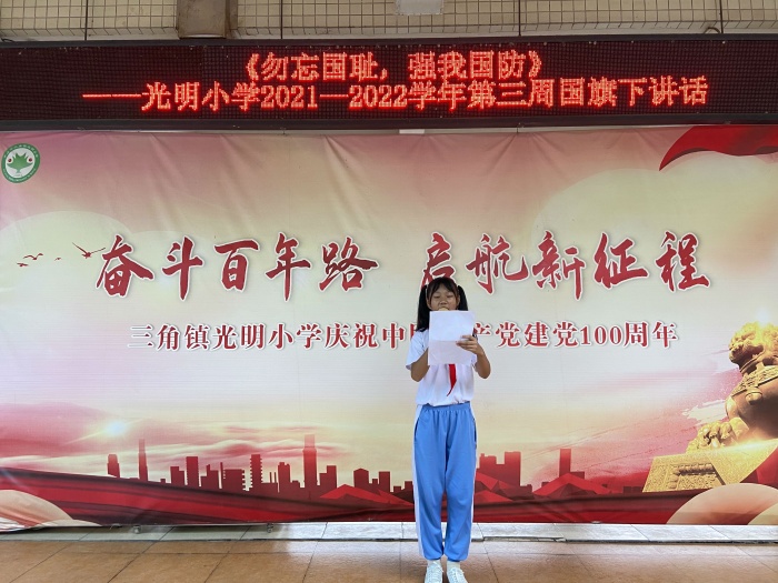 活動(dòng)伊始,由六(1)中隊(duì)學(xué)生代表張瑋伽進(jìn)行《勿忘國(guó)恥,強(qiáng)我國(guó)防》國(guó)旗下講話,講述“九一八”事變的由來(lái)?!?931年9月18日夜,盤(pán)踞在中國(guó)東北的日本關(guān)東軍按照精心策劃的陰謀,由鐵道“守備隊(duì)”炸毀沈陽(yáng)柳條湖附近日本修筑南滿鐵路路軌,并嫁禍于中國(guó)軍隊(duì),日軍以此為借口,炮轟中國(guó)東北軍北大營(yíng),制造了震驚中外的“九一八事變”。”張瑋伽同學(xué)的講話慷慨激昂,號(hào)召同學(xué)們勿忘國(guó)恥,奮發(fā)圖強(qiáng),用實(shí)際行動(dòng)為實(shí)現(xiàn)偉大的中國(guó)夢(mèng)貢獻(xiàn)力量。