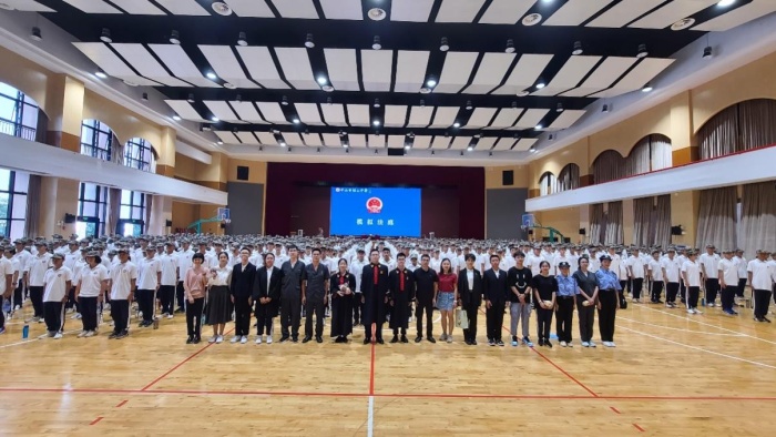 9月27日下午,桂山中學在陳戈平體育館開展了一場別開生面的模擬法庭活動。此次模擬法庭活動以一起校園早戀引發(fā)的校園欺凌致過失傷人案件為素材,桂山中學14名高一新生分別扮演法官、公訴人、辯護人、被害人、被告人等角色,為1000多名高一軍訓新生上了一堂生動的觀摩法治教育課。中山市第一人民法院三鄉(xiāng)人民法庭副庭長鄒軍,中山市第一人民法院審判管理辦公室王俊超、苑鵬作為特邀專家出席活動,德育處陳建科副主任擔任本次活動主持。