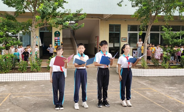 八點整,升國旗儀式正式開始。國旗護(hù)衛(wèi)隊邁著堅定的步伐走向升旗臺。鮮艷的五星紅旗在激昂雄壯的國歌聲中冉冉升起、迎風(fēng)飄揚,全體師生肅立注目,齊唱國歌。國旗下,教務(wù)處主任吳偉卿激勵每一位學(xué)生要感恩國家的付出,好好學(xué)習(xí),豐富知識,增長才干,長大后把祖國建設(shè)得更加強大。接著,六(1)班的四位同學(xué)以激情澎湃的詩朗誦《強國力量》向偉大的祖國致敬。他們把文字蘊含的振奮人心、群情激昂、波瀾壯闊和自己內(nèi)心對偉大的黨和親愛的祖國的熱愛和自豪之情,展現(xiàn)得淋漓盡致,深入人心。