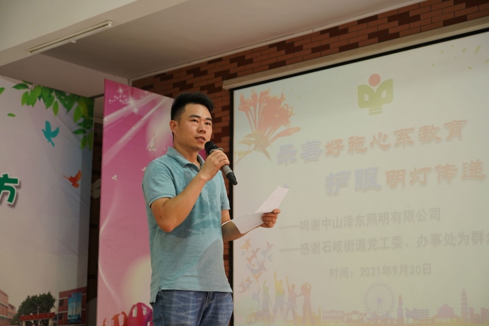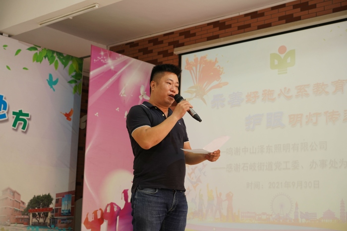 接著愛心企業(yè)代表——中山澤東照明有限公司項目副總經(jīng)理金起發(fā)叔叔進(jìn)行了發(fā)言。金叔叔從青少年近視的現(xiàn)狀、近視與學(xué)校家居環(huán)境的關(guān)系等方面呼吁青少年要高度重視視力健康。希望同學(xué)們保護(hù)雙眼,用心學(xué)習(xí),努力成為祖國的優(yōu)秀人才。
