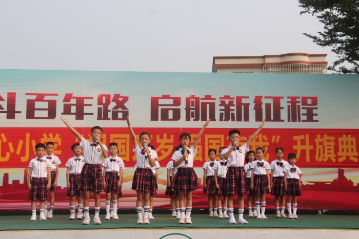 活動伊始,雄渾的國歌蕩漾在校園,初升的紅日照耀在美麗的中心小學。當激昂的國歌響起,鮮艷的五星紅旗緩緩升起,全體師生行注目禮,用心感受著國旗升起的莊嚴時刻。升旗儀式后,吳博事校長發(fā)表熱情洋溢的致辭。吳校長深情祝賀祖國72歲華誕,72年風雨兼程,72年勵精圖治,偉大的中國發(fā)生了翻天覆地的變化。他盛情邀請全體師生,高聲同祝:“祖國,生日快樂!祖國萬歲,強國有我!”向全體師生寄予厚望,勉勵大家用實際行動擦靚那一抹“中國紅”,涵養(yǎng)家國情懷,砥礪強國之志,為祖國的偉大復興共同奮斗!隨后,校合唱隊演唱《少年,少年,祖國的春天》,學生們嘹亮的歌聲飽含向往祖國美好未來、期待中華民族振興的熱切希望。學校致力于把下一代教育好、培養(yǎng)好,從娃娃抓起,從小根植愛國情懷,立志報國。三(6)班學生共同朗誦《祖國媽媽,我愛您》。他們的朗誦充滿激情,或慷慨激昂,或低沉婉轉,或抑揚頓挫,以飽滿的熱情,挺直的脊梁,發(fā)自肺腑聲音,深情訴說著對祖國的熱愛。