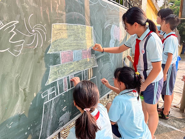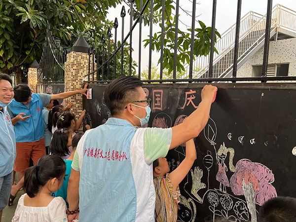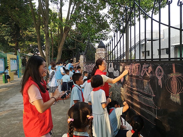 為使學生了解新中國建立的艱辛歷程和祖國建設取得的偉大成就,理解中國共產黨領導中國人民走社會主義道路是歷史的必然選擇,增強對偉大祖國、黨和人民的熱愛,進一步把愛國情感化為具體行動,立志為實現(xiàn)中華民族偉大復興作出貢獻,在祖國母親生日到來之際,濠涌小學的黨員教師帶領家長義工和學生一起布置起班級的涂鴉墻。小小巧手贊祖國,大大畫筆繪山河,涂鴉墻在大家的共同努力下充滿了節(jié)日喜慶的色彩,為獻禮祖國涂上了濃墨重彩的一筆。