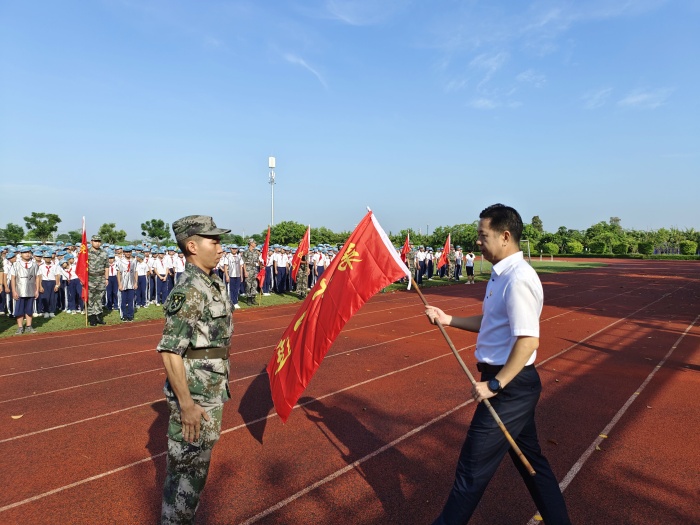 開營儀式上激動(dòng)人心的時(shí)刻就是授旗儀式的時(shí)候了。港口中學(xué)廖志堅(jiān)校長為初一新生14個(gè)連授連旗。14位教官精神抖擻地接過連旗,挑起了國防訓(xùn)練的囑托和重任。