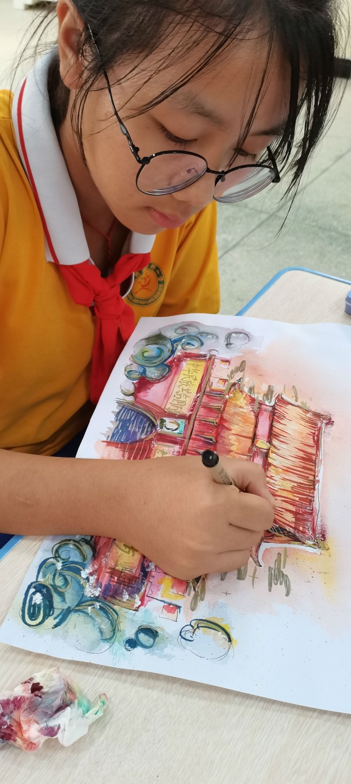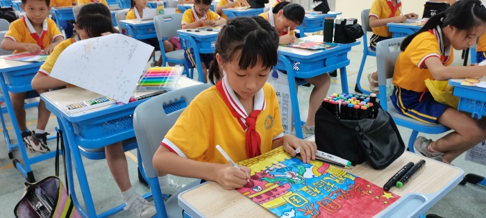 本次以“喜迎國慶,祝福祖國”為主題的愛國主義繪畫活動在南朗小學(xué)大禮堂進行現(xiàn)場書畫創(chuàng)作。比賽現(xiàn)場,同學(xué)們作畫方式多樣:有的同學(xué)先用鉛筆構(gòu)圖;有的同學(xué)直接用勾線筆造型;還有的同學(xué)用的是水彩的表現(xiàn)手法。同學(xué)們通過各種線條、色彩,仔細地描繪和表達他們看到的、感受到的、想到的心中最美的祖國,畫中充滿對祖國的大好河山的喜愛之情,流露出對祖國母親深深的熱愛。而在書法比賽現(xiàn)場中,同學(xué)們書寫的是習(xí)近平總書記的重要講話內(nèi)容,字字都表達了同學(xué)們對中華人民共和國深深的愛意。