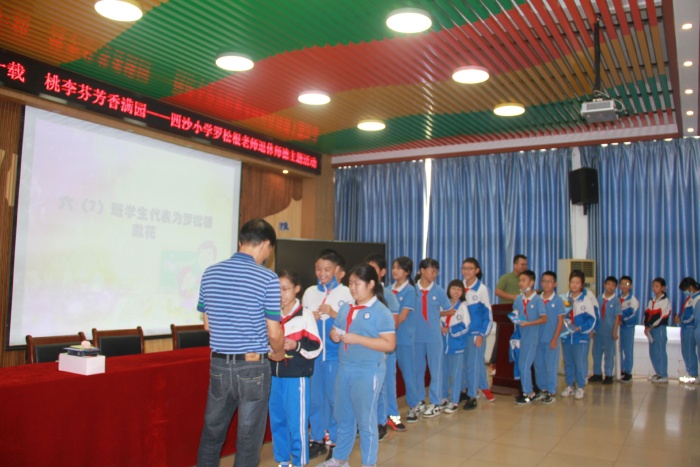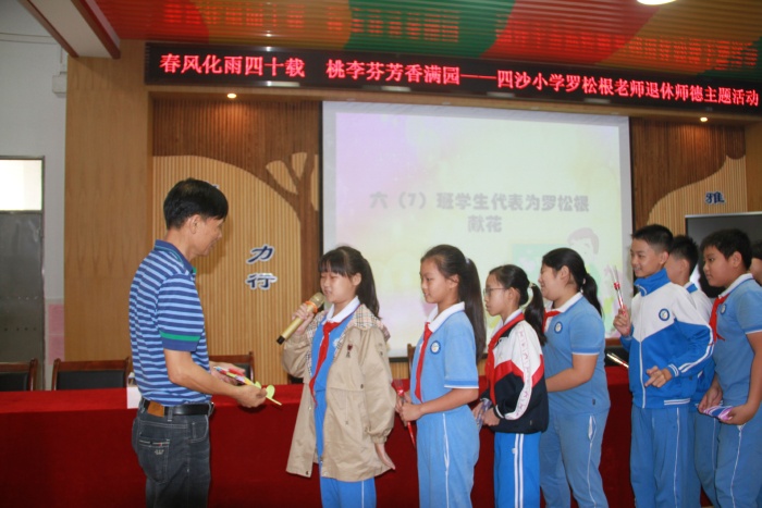 在經(jīng)久不息的掌聲中,四沙小學(xué)校長歐慧芳向羅松根老師贈送了上書“春風(fēng)化雨四十載 桃李芬芳香滿園”的錦旗,表達(dá)了對羅松根老師為人民的教育事業(yè)所作出的巨大貢獻(xiàn)的充分肯定。羅老師也上臺作了發(fā)言。他希望全體同學(xué)聽老師的話,好好學(xué)習(xí),天天向上,長大后做一個對社會有用的人。