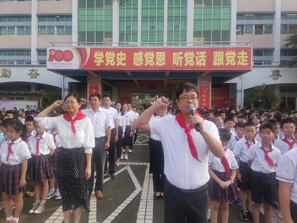 緊接著,少先隊員們高舉鮮艷的黨旗和隊旗,英姿颯爽地來到升旗禮臺前,全體隊員敬隊禮,高唱少先隊隊歌,嘹亮的歌聲立刻飄揚在校園上空,久久回蕩。一曲結(jié)束,學(xué)校黨員教師面向鮮紅的黨旗,在華校長的帶領(lǐng)下緊握右拳,宣讀誓詞,整齊堅定的話語深深地震撼了全體師生。大隊輔導(dǎo)員阮秀迎老師帶領(lǐng)全體少先隊員重溫入隊誓言,稚嫩真摯的童聲里飽含著深深的報國情。