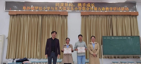 古詩(shī)是中華民族的文化瑰寶,為提升教師古詩(shī)教學(xué)能力,深入探討古詩(shī)教學(xué)規(guī)律,進(jìn)一步完善羅松小學(xué)市級(jí)課題《小學(xué)古詩(shī)“情境探究”教學(xué)研究》,10月22日下午,羅松小學(xué)與東鳳鎮(zhèn)安樂小學(xué)聯(lián)合開展了以“同課異構(gòu),攜手成長(zhǎng)”為主題的教學(xué)研討沙龍活動(dòng)。