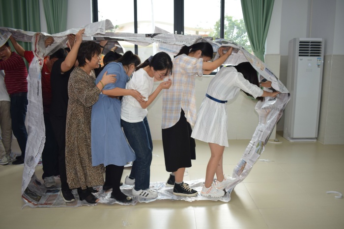 本次活動內(nèi)容豐富,形式多樣,趣味十足。王雅老師先是營造了在荒島求生大背景,然后帶領(lǐng)教師們進(jìn)行三輪體驗式活動:第一輪是建立互助逃生小組,教師們自由組建7人小組,選出隊長,大伙一起商量編隊名、唱隊歌,接著進(jìn)行2分鐘團(tuán)隊士氣展示;第二輪是尋寶大作戰(zhàn),尋找逃出荒島的物資:6只襪子、一副眼鏡、兩個水壺、兩對鞋、一個包,比一比哪一組用時最短;第三輪是無敵風(fēng)火輪,每小組利用報紙和膠帶制作一個可以容納全體團(tuán)隊成員的封閉式大圓環(huán),將圓環(huán)立起來全隊成員站到圓環(huán)上邊上行走,滾動大圓環(huán)最快的為最終贏家。三輪活動總分前三名的小組勝出。每一輪活動結(jié)束后,王雅老師都會組織教師們進(jìn)行5分鐘的反思分享,思考在這個環(huán)節(jié)中小組成員或自己為什么這么快或這么慢完成任務(wù)?贏了或輸了的原因是什么?下一次個人或團(tuán)隊如何才能做到最好?教師們在分享環(huán)節(jié)能積極發(fā)言,結(jié)合自己的切身體會分享了自己的所見所聞、所思所想,得到了老師們的一致好評。