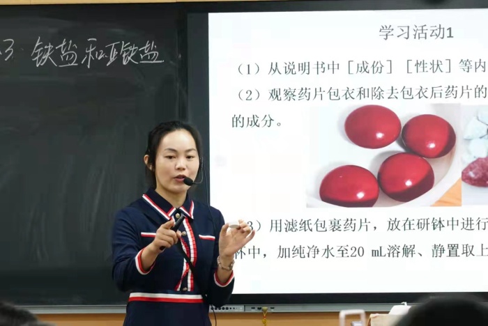 洪文坤老師以“缺鐵性貧血癥狀”的生活情境引入本節(jié)課《鐵鹽與亞鐵鹽的檢驗(yàn)及相互轉(zhuǎn)化》的學(xué)習(xí)。課堂上注重學(xué)生的主體地位,以學(xué)生動(dòng)手實(shí)驗(yàn)探究為主,教師總結(jié)評(píng)價(jià)。教學(xué)內(nèi)容也注重學(xué)生能運(yùn)用所學(xué)知識(shí)解決生活、工業(yè)生產(chǎn)中的實(shí)際問題:如蘋果汁顏色變化問題,補(bǔ)鐵劑和與維C同服的原因探究。教學(xué)過程中師生互動(dòng)性強(qiáng),收到了良好的教學(xué)效果。