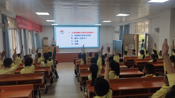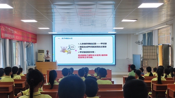 講座開始,首先由中山火炬開發(fā)區(qū)醫(yī)院鄧成主任為學(xué)生開展“碘缺乏病知識(shí)講座”,鄧醫(yī)生運(yùn)用生動(dòng)的語言,典型的案例,通過深入淺出的講解和示范,分別從什么是碘,什么是碘缺乏病,碘缺乏病的危害及癥狀,如何正確食用碘、怎樣預(yù)防碘缺乏病等多個(gè)方面向?qū)W生傳授碘缺乏病的防控知識(shí)。學(xué)生們認(rèn)真的聽講,積極發(fā)言,明白了日常生活中不正確食用碘鹽的危害,以及平時(shí)在生活中如何正確補(bǔ)充“碘”。同學(xué)們?yōu)楦兄x鄧醫(yī)生的分享,現(xiàn)場(chǎng)響起一陣陣的掌聲。