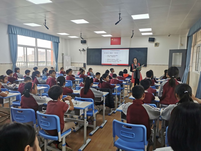 緊接著,是學(xué)生分組匯報環(huán)節(jié)。學(xué)生在指導(dǎo)下,完整而清晰地匯報自己的學(xué)習(xí)所得。一個學(xué)生匯報完,緊接著下一個學(xué)生補充,學(xué)生由一開始的拘謹(jǐn)漸漸變得大方,對學(xué)校的了解也逐漸深入,課堂的學(xué)習(xí)氛圍愈發(fā)濃厚。