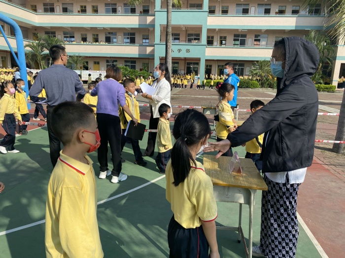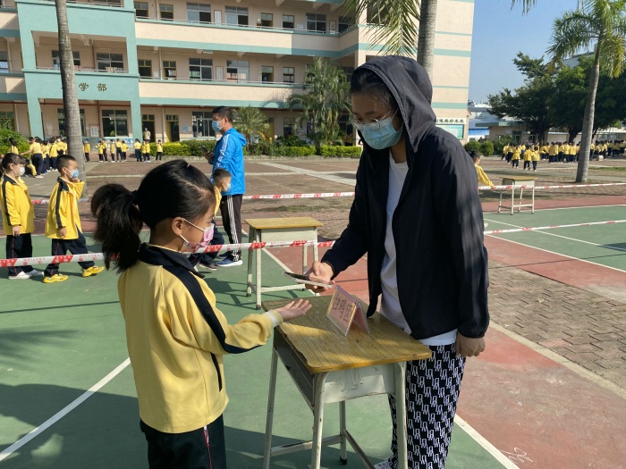 同學們帶好自己的二維碼,拍好整整齊齊的隊伍,有條不紊、按要求進入監(jiān)測分區(qū),他們佩戴好口罩,保持好間距,安安靜靜,依次通過檢測口,顯得紀律嚴明,訓練有素。